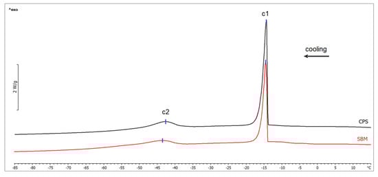 In the examined adipose tissue samples, there were no statistically significant differences in the water content in the samples between examined groups (22.86 ± 3.76 g/100 g and 26.97 ± 4.22 g/100 g, for the SBM and CPS group, respectively; p = 0.059). Figure 1 shows the sample thermograms obtained during the crystallization of lipids in the examined subcutaneous fat samples. The results of determined thermal parameters are given in Table 2. The first exothermic peak in crystallization curve, marked as c1, corresponds to the freezing of the water present in subcutaneous fat tissue [5]. The freezing temperature did not differ between groups (p = 0.531). However, the net enthalpy was greater in the subcutaneous fat samples obtained from broilers in the CPS group (p = 0.029). The phase transition marked as c2 is associated with crystallization of lipids [29]. No statistically significant differences were found between the examined groups, either in the lipid crystallization temperature (p = 0.753) or in the net transition enthalpy (p = 0.434).