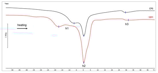 DSC heating thermograms of subcutaneous fat samples from broiler chickens fed soybean meal (SBM) and chickpea seeds (CPS). Exothermal processes are directed up.