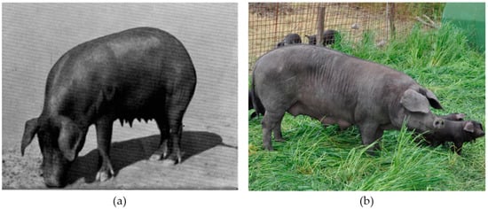 (a) An example of the original type called “Nera Parmigiana” found in an historical book [3]; (b) Nero di Parma sow with piglets (Authors’ own repository).