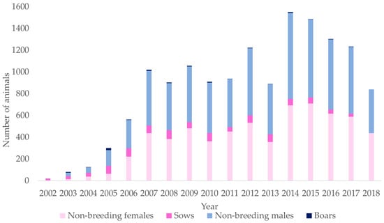 Animals registered per year of birth divided by sex and with or without progeny: Boars, non-breeding males, sows, and non-breeding females.