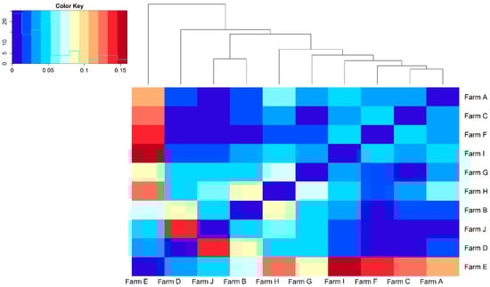 The analysis of the RP in terms of farms available showed that only 10 farms are currently operating. The Wright F parameters FIS, FST and FIT were calculated based on the aforementioned farms and were equal to −0.07, 0.12, and 0.06, respectively. In Figure 3 is presented the heatmap as graphical representation of the FST pairwise comparison. In the case of Farm E, the FST showed moderate to high differentiation to all the remaining farms. In contrast, seven farms showed no genetic differentiations based on the FST values.
