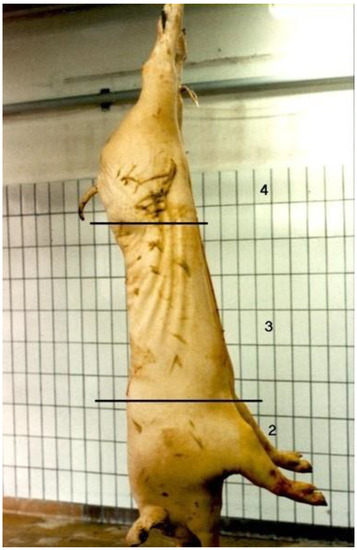 The skin lesion score is associated with aggressive behaviour and, therefore, useful to analyse the fighting behaviour of pigs [23]. The skin of the left carcass side of the transported pigs was evaluated in the slaughter line 30 min post-mortem by the same team (2 persons) throughout 30 transports. After scalding and evisceration, skin lesions were visually assessed in different parts of the left carcass, i.e., shoulder, middle and ham, using the anatomical locations and procedures described by Barton Gade et al. [24]. A 4-point photographic scale was used, starting at 1 = no damage and 4 = extreme damage (Figure 1). The used scale can be considered as a combination of the number and the severity of the lesions. Only recent/fresh skin lesions were registered. The change in colour from red (recent lesion) to yellow (older lesion) offers the possibility to differentiate between recent and older skin lesions [25]. Fresh skin lesions may indicate damage due to transport and lairage conditions [26].