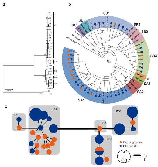 We constructed the ML tree using IQ-tree based on 40 buffalo mitogenomes, 13 representative sequences of swamp mtDNA haplogroups (SA1, SA2, SA3, SB1, SB2, SB3, SB4, SC, SD, SE) and 2 riverine sequences; Syncerus caffer (accession no. NC_020617.1) was used as an outgroup (Figure 1b). Phylogenetic analyses showed that all the Guangxi buffalo belong to the swamp buffalo. The 40 Guangxi buffalo can be divided into two major swamp haplogroups (SA and SB with various subclades), and no rare haplogroups (SC, SD, SE) were detected (Table 1, Figure 1a–c). Haplogroup SA1 was extremely frequent (60%) in the two Guangxi buffalo breeds, while SB1 and SB3 occurred mainly in the Xilin buffalo. We also found that the haplogroup SB2 was only detected in the Fuzhong buffalo.
