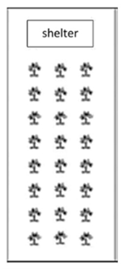 - Arnould, C.; Faure, J.M. Use of pen space and activity of broiler chickens reared at two different densities. Appl. Anim. Behav. Sci. 2003, 84, 281–296. [Google Scholar] [CrossRef]