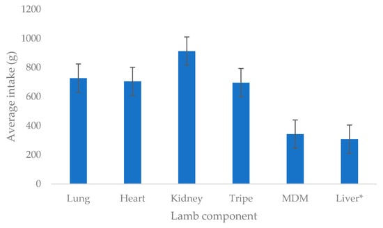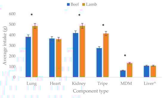Average intake of equivalent beef and lamb components offered in the two-bowl preference test. (Results with an asterisk indicate a significant difference in intake between equivalent components (p < 0.05), ^ maximum possible intake of each liver was 113.5 g compared to 500 g for the other components).