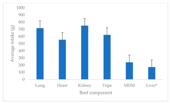 For the components that had a maximum possible intake of 1000 g throughout the week, lung, kidney and tripe, as well as lung, heart and tripe showed comparable total intakes (p > 0.05), with MDM showing the lowest intake (p < 0.05). The panel members consistently consumed nearly all the liver presented throughout the week. Within each component, the day of testing had no influence on the intake results (p > 0.05). However, intake levels were different for the components tested (p < 0.05).