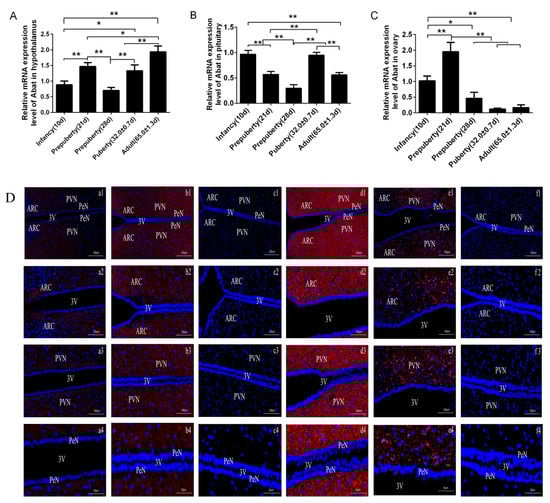 The expression of Abat mRNA at different developmental stages of rats in the hypothalamus, pituitary and ovary is shown in Figure 1. In the hypothalamus (Figure 1A), Abat mRNA level was significantly reduced at infancy, 28 d, puberty (p < 0.01) and 21 d (p < 0.05) rats compared with adults; the level of Abat mRNA at infancy and 28 d were significantly lower than that at 21 d and puberty (p < 0.01). In the pituitary (Figure 1B), the level of Abat mRNA was the lowest at 28 d, which was significantly lower than that at infancy, 21 d, puberty and adult (p < 0.01); there was no significant difference in the expression of Abat mRNA between infancy and puberty (p > 0.05), but, compared with these two periods, the expression of Abat mRNA was significantly reduced at 21 d and adult stages (p < 0.01). In the ovary (Figure 1C), compared with 21 d, the Abat mRNA level were significantly reduced in infancy, 28 d, puberty and adult (p < 0.01); the Abat mRNA level in infancy was significantly higher than that at 28 d (p < 0.05), puberty and adult (p < 0.01). No differences were found between 28 d, puberty and adult (p > 0.05).