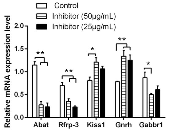 Effects of GABA-T inhibitors on the expression of reproduction-related genes in hypothalamic neurons. ** indicates a very significant difference (p < 0.01); * indicates a significant difference (p < 0.05). Vigabatrin was used as a GABA-T inhibitor.
