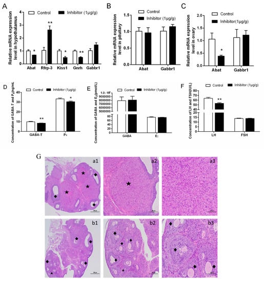 In addition, the levels of Abat mRNA, Kiss1 and Gnrh mRNA were reduced, while the Rfrp-3 and Gabbr1 mRNA expression were increased in the rat at VO after GABA-T inhibitor injection into lateral ventricle. The results were contrary to the expression of reproductive genes in vitro, but supported the inhibition of GnRH release by GABA in monkeys and adult rats, and were contrary to the activation of GnRH neurons by GABA in 7 d rats and adult female sea lamprey, suggesting that in environment in vitro and vivo, species and age may influence the regulation of GnRH neurons by GABA-T [19,57,58]. However, there was no significant difference between the inhibitor group and the control group in the mRNA of Abat and Gabbr1 in the pituitary and ovaries of rats during VO, indicating that GABA-T inhibitors only had a significant effect at the hypothalamus level and had a weak effect on the pituitary and ovary. Therefore, RFRP-3, kisspeptin and GABA are related to the secretion of GnRH, and GnRH is a core substance in the regulation of animal reproduction, indicating that GABA-T mainly regulates the expression of RFRP-3, kisspeptin, GnRH and GABA in the hypothalamus and neurons of female rats.