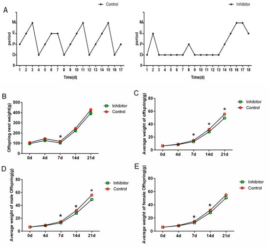 Rat offspring were weighed to calculate nest weight and average body weight. At day 7, offspring nest weight in the inhibitor group was significantly lower than in the control group (p < 0.05); the differences on other days were not significant (p > 0.05) (Figure 4B). The average body weight of the offspring (Figure 4C) and the average body weight of the male offspring (Figure 4D) showed that the weights of the inhibitor group were reduced at 7, 14 and 21 d compared with the control group (p < 0.05); 0 and 4 d had no significant differences between the two groups (p > 0.05). Comparing the inhibitor group with the control group, the average weight of female offspring (Figure 4E) at 7 and 14 d were decreased (p < 0.05); no differences were found between the two groups at 0, 4 or 21 d (p > 0.05).