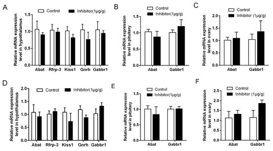 In order to verify the short-term effect of the GABA-T inhibitor on reproductive genes in rats, we tested the expression of reproduction-related genes by RT-qPCR. In the rats at 25 d, the expression of hypothalamic Abat, Rfrp-3, Kiss1, Gnrh and Gabbr1 mRNAs (Figure 5A), pituitary (Figure 5B) and ovarian (Figure 5C) Abat and Gabbr1 mRNAs were not significantly different between the inhibitor group and control group (p > 0.05). In the adult rats, the expression levels of hypothalamic Abat, Kiss1 and Gnrh mRNAs were decreased (Figure 5D), but Rfrp-3 and Gabbr1 mRNA showed no significant difference (p > 0.05). Abat and Gabbr1 mRNA levels had no difference between the pituitary (Figure 5E) and ovary (Figure 5F) (p > 0.05).