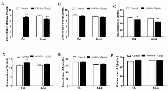 The serum reproductive hormone levels in 25 d and adult rats injected with 1 μg/g vigabatrin after 4 h are shown in Figure 6. We found that the serum GABA-T (p < 0.01) and LH (p < 0.05) concentrations (Figure 6A,C) in 25 d and adult rats were significantly lower in the inhibitor group than the control group, but FSH concentration (p < 0.01) (Figure 6D) was increased in rats at 25 d. The levels of P4 (Figure 6F), GABA (Figure 6B) and E2 (Figure 6E) in the animals at 25 d and adult were not significantly different between the two groups (p > 0.05).