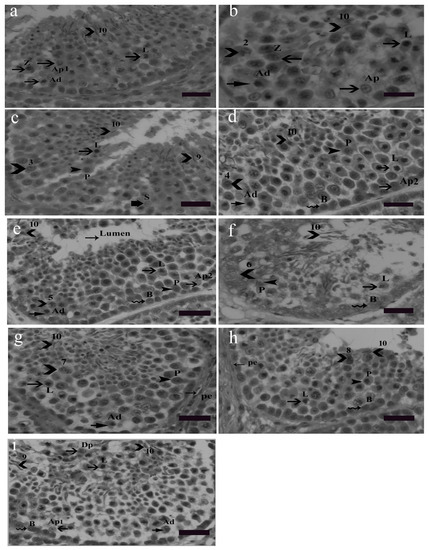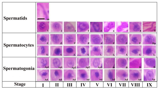 Spermatogonia were mainly distinguished based on nuclear characteristics, heterochromatin appearance and distribution [29,30]. In all slides, germ cells were identified on the basis of the relative size, shape and nuclear morphology. Identification of the various stages of the seminiferous epithelium was facilitated by microscopically analyzing morphological changes in the germ cells’ developmental stages and cellular associations.