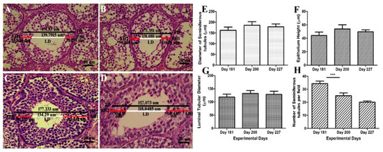 Histological diagrams in Figure 3A–D shows the method of measuring the diameter of ST, EH and LD. Figure 3E–G shows that there was a positive correlation between the diameter of the seminiferous tubules, epithelial height and lumen diameter. They followed the same ascending and descending pattern throughout the experimental period. While the number of seminiferous tubules per field in Figure 3H exhibited a descending pattern throughout the experimental period. There was a significant decrease in the no. of ST/field on day 200 as compared to day 181. On day 227 it continued to decline and reached 20 tubules per field. Graphical data show that the number of ST per field was negatively correlated to testis weight, ST diameter, EH and LD.