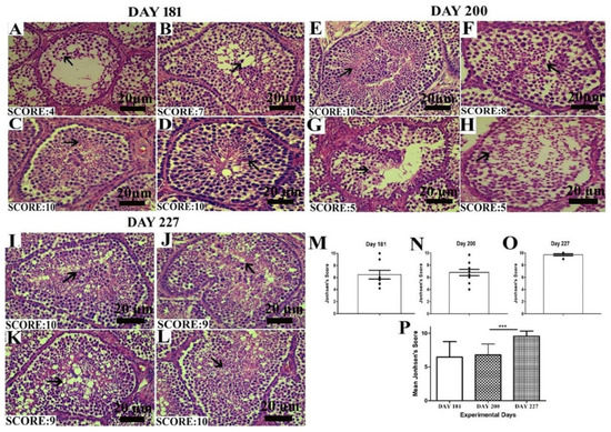 Images of histological sections on days 181 (A–D), 200 (E–H) and 227 (I–L) showing seminiferous tubules at different stages of spermatogenesis by the Johnsen score. Scale bar 20 µm at 40× magnification. (M–O) Graphical representation of the Johnsen score on days 181, 200 and 227 at a 95% confidence interval. (P) The mean Johnsen score. Data are shown as the mean values ± standard error of the mean, *** indicates difference p < 0.001, respectively between the groups. Scale bar = 20 µm.