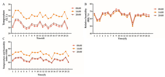 Temperature (T, °C) and relative humidity (RH, %) in the cowshed were measured at 8:00, 14:00 and 20:00 every day during the experiment. Electronic thermometers at the six fixed points in the cowshed were read, respectively. The temperature humidity index (THI) criteria were derived from the NRC (1971), and THI was calculated according to THI= (1.8 × T + 32) − (0.55 − 0.55 × RH) × (1.8 × T−26), where T is the temperature (°C) and RH is the relative humidity (%) [
