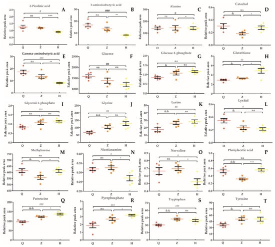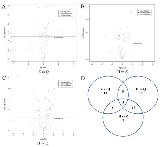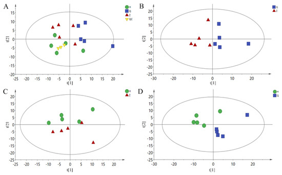 ChemStation (version E.02.02.1431, Agilent, USA) software was used to convert the raw data (D format) to Common Data Format (CDF), and then the CDF data were imported into the ChromaTOF software (version 4.34, LECO, St Joseph, MI, USA) for data processing. Metabolites were annotated through the Fiehn or NIST database. After alignment with Statistic Compare component, the ‘raw data array’ (.cvs) was obtained from raw data with three dimension data sets including sample information, peak names (or retention time and m/z) and peak intensities. There were 728 peaks detected from all samples. In the ‘data array’, all internal standards and any known pseudo positive peaks (caused by background noise, column bleed or BSTFA derivatization procedure) were removed. The data was normalized to the total peak area of each sample, and multiplied by 10000, and the peaks from the same metabolite were combined. The total detectable metabolites were 227. Data were transformed by log2 in Excel 2007 (Microsoft, USA) (use 0.000001 to replace 0 before transforming), and the resulting data matrix were then imported into SIMCA software package (14.0, Umetrics, Umeå, Sweden). Principal component analysis (PCA) and orthogonal partial least-squares discriminant analysis (OPLS-DA) were performed to visualize the metabolic difference among experimental groups, after mean centering and unit variance scaling. The Hotelling’s T2 region, shown as an ellipse in score plots of the models, defines the 95 % confidence interval of the modeled variation. Variable importance in the projection (VIP) ranks the overall contribution of each variable to the OPLS-DA model, and those variables with VIP > 1 are considered relevant for group discrimination. The differential metabolites were selected on the basis of the combination of a statistically significant threshold of VIP values obtained from the OPLS- DA model and p values from a two-tailed Student’s t-test on the normalized peak areas from different groups (Z vs Q, H vs Z, H vs Q), where metabolites with VIP values larger than 1.0 and p values less than 0.05 were considered as differential metabolites. The fold change (FC) of different metabolites in the two groups was calculated. The multiple of change is the ratio of the average content of the differential metabolite in the two groups.