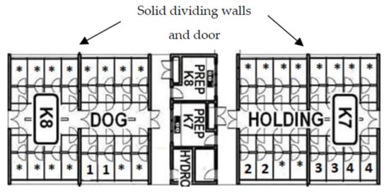 Kennels used for the measurement of the behaviour of dogs (n = 60) exposed to, Music, DAP, Lavender stimuli or a Control. K7 and K8 were the two blocks of dog kennels used for the study. 1: kennels for the Lavender treatment; 2: kennels for the Music treatment (separated from the other treatments by solid dividing walls); 3: kennels for the Control treatment; 4: kennels for the DAP treatment; *: kennels not holding a study dog.