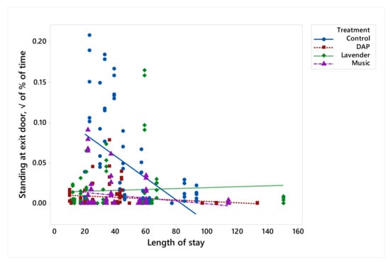 Relation between length of stay and √ % of time standing at exit door of dogs (n = 60) from the Lavender, Music, DAP and Control treatments during the 3-h treatment period.