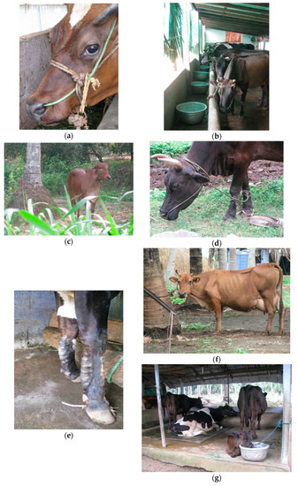 (a) The halter used on all cows, (b) close-tied in the shed, (c) longline tether, approx. 10 m (Bos indicus heifer not in study population, choosing to stand near tree), (d) hobbled cow, (e) hobbling injuries, (f) close-tied outside, and (g) rubber mat under one cow.