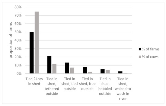 Although the study looked at a range of different farm sizes (2–150 cows), the farm sizes were small (mean 15 cows, median 8) on average. Anecdotally, it was suggested that there was a trend for larger, wholly indoor farms becoming more common, and we found that larger farms were associated with more time spent indoors and being close-tied. All cows spent at least half of the day close-tied inside housing, and three-quarters of the cows spent all day close-tied inside. In this study, all cows were fitted with a rope halter that pierced the nasal septum, which results in pressure on sensitive tissues throughout the life of the cow and, if carried out without analgesia, would be painful. Tie-stall housing systems for dairy cows are used in many parts of the world; however, the prevalence in this study (100%) was higher than the prevalence reported in other countries. In Europe, between 20% (in lowland areas) and 80% (in upland areas) of cows were reportedly tethered at least during the winter [14]. Tie stalls were the primary housing type for lactating cows on 39% of farms in the USA in 2014 [15]. Several countries have introduced bans on building new tie-stall systems, and complete bans are also being introduced—for example in Sweden, where approximately 32% of dairy cows were in tie-stall systems in 2015, the construction of new tie-stall barns has been banned since 2007 [16]. Likewise, in Norway, building new tie-stall barns is banned and a complete ban on tie-stalls is scheduled for 2034 [17].