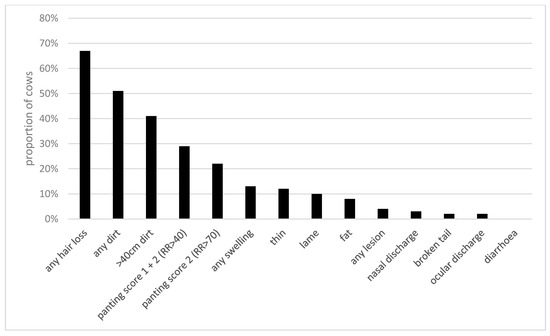 Investigations of the relationships between measures showed that lame cows were more likely to be observed panting (p < 0.001) but less likely to be recorded as dirty (p = 0.016). In addition, cows recorded as dirty were more likely to have at least one area of hair loss (p = 0.001). Hair loss and swellings were positively associated (p < 0.001) but swellings were less likely to be observed in panting (p = 0.026) or thin (p = 0.016) cows. Thin cows were less likely to have hair loss (p = 0.037) but more likely to be observed panting (p = 0.021). Cows that spent any time outside were less likely to be observed as lame (p = 0.001), dirty (p = 0.034), with hair loss (p = 0.026), with a deep ruminal depression (p < 0.001), panting (p = 0.001) and thin (p = 0.012), but more likely to be recorded with a swelling (p < 0.001) and as uneasy/frightened (p = 0.003). Cows housed on a rubber mat were more likely to be recorded as lame (p < 0.001), panting (p < 0.001) and thin (p = 0.005) but less likely to be dirty or have a swelling (both p < 0.001). Larger farms were associated with more dirt and hair loss being recorded (both p < 0.001) but fewer uneasy/frightened cows (p = 0.005). The longer cows spent in the shed, the more likely they were to be recorded as lame (p = 0.006), thin (p = 0.016) and with hair loss (p = 0.004), but less likely to have swellings (p = 0.001) and be uneasy/frightened (p = 0.003). Thin cows were more likely to be recorded on farms with a higher mean milk yield (p = 0.028).