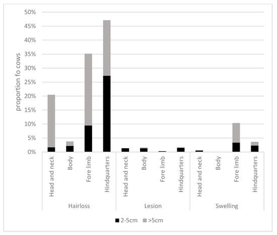 The proportion of cows recorded with hair loss, lesions and swellings in different body regions.