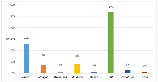 The samples with ≤50,000 cells/mL were analyzed by qPCR to identify the presence of bacteria. Overall, 20.75% of the samples (187) were positive and the distribution of the results is reported in Figure 1. Data show that one third of the positive samples harbored contagious pathogens, while about half of them were positive for coagulase-negative staphylococci (CNS).