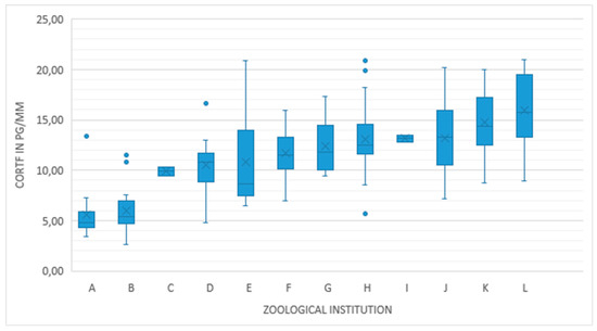 Figure 1 shows the distribution of CORTf within the individual zoological institutions. In every individual zoo the CORTf values spread across their respective means, which range from 5.62 pg/mm for zoo A up to 15.96 pg/mm for zoo L.