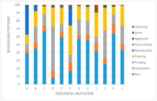 The documented behavioral patterns show a high level of variability in their proportionate occurrence. This is impeded by a more variable breeding cycle: while in one zoo 50% of the group was involved in reproduction and their chicks hatched in May, in another zoo not more than 20% of the group were building nests in June, and others did not breed at all. Consecutively, incubating individuals that spent between 45% and 50% of the time per day on the nest were compared with parents feeding a few times per day or individuals that are not engaged in reproduction at all. Due to the low number of zoos and the high variability, we decided to do description only.