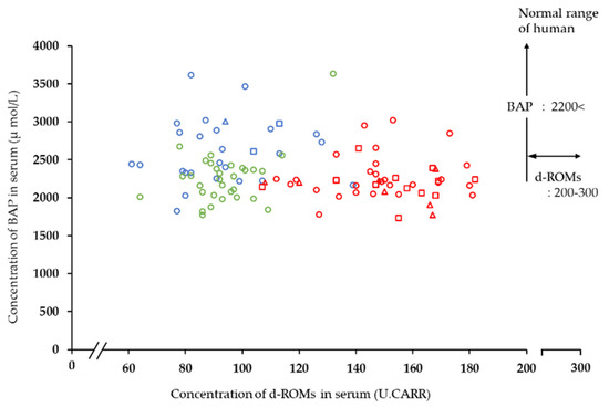 Comparison between diacron-reactive oxygen metabolite (d-ROM) and biological antioxidant potential (BAP) concentrations in serum of horses in an equestrian club in Shizuoka Prefecture and that of other animals (dairy cattle and dogs). Red symbols: horses in an equestrian club in Shizuoka Prefecture used in our study (circle: thoroughbred; square: pony; triangle: full-sized horses other than thoroughbred). Blue symbols: dairy cattle (circle: Holstein Friesian; triangle: Brown Swiss; square: Jersey). Green symbols: dogs.