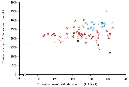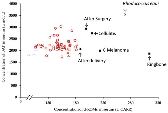 Comparison between d-ROM and BAP concentrations in serum of horses in an equestrian club in Shizuoka Prefecture and that of horses suffering disease or other stress. Red symbols: horses in an equestrian club in Shizuoka Prefecture in our study (circle: thoroughbreds; square: ponies; triangle: full-sized horses other than thoroughbreds). Black symbols: horses suffering disease or other stress (square: horses in our study; other symbols: data from previous reports [21,22,23]).