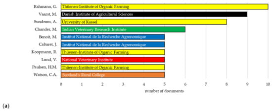 In terms of number of published documents per author, G. Rahmann [17] was the main author who has published papers on the topic covered from 2002 to 2015. In terms of longevity, A. Sundrum [18] covered the widest timespan (1993 to 2017), publishing papers related to organic livestock production. Thünen Institute of Organic Farming [19] in Germany (G. Rahmann, R. Koopmann, and H.M. Paulsen) conducts interdisciplinary research in organic farming, mainly in organic livestock farming and crop production. Organic farming and, in particular, organic livestock research is also covered by M. Vaarst [20], M. Chander [21], M. Benoit [22], and J. Cabaret [23]. However, J. Cabaret has dealt with parasitology research [23].