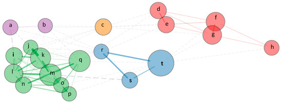 Co-citations of the references within a specific area of research allow to identify the most relevant references. They indicate the frequency with which two documents are cited together by other documents [26]. Those patterns can vary over time as a result of changes in interests and intellectual patterns of a field [26]. Co-citation analysis of the 20 most co-cited references revealed five clusters (Figure 7). The red cluster includes two studies on ethnoveterinary (letters f and h), and papers that dealt with the use of plants in livestock (letters d and e) or in vitro studies with essential oils (letter g). The green cluster includes studies more related to agriculture (soil, environmental studies, and crops; letters i to k). The blue cluster identifies papers more focused on livestock (letter s and t) or quality of animal-derived products (letter r). The biggest nucleus (letter t in Figure 7), which means that it is the most co-cited, refers to the review published by M. Hovi as first author. This document was also the most cited in our dataset (Table 1b), which confirms that two documents frequently co-cited are also frequently cited individually [26]. Moreover, this review (letter t in Figure 7) was written in collaboration with A. Sundrum, who is one of the most productive authors in our dataset (Figure 6). Nucleus ‘s’ (Figure 7) refers also to a review paper published by A. Sundrum about organic livestock farming (Table 1). Furthermore, A. Sundrum is the author who has published on that topic for a longer time, and he is currently affiliated with a university in Germany (Figure 6).