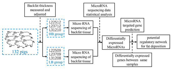 Using the same animals (female Landrace pigs) and methodology that we used in a previous study [18]; high backfat (HB) and low backfat (LB) pairs were selected as follows. The HB individual in a pair, had at least twice the backfat thickness as the LB individual, and the HB/LB pairs were full-siblings from the same litter. All 132 female Landrace pigs (185.53 ± 8.82 days old; 93.27 ± 18.64 kg) were kept in uniform and standard conditions and had ad libitum access to the same diet (Ninghe, China). Backfat thickness was measured between the 3rd- and 4th-last ribs using real-time B-mode ultrasonography (Honda Electronics, Toyohashi, Japan). Age, weight, backfat thickness, and pedigree information for the chosen pigs are shown in Supplementary Materials Table S1. Three of the HB/LB pairs that showed extremes of backfat thickness were selected for miRNA-seq (Figure 1). The backfat thickness was adjusted to 100 kg as follows:
