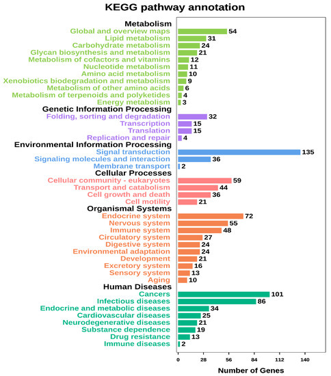 To elucidate the functions of the DEMs, we predicted their potential target genes. A total of 3600 and 2124 putative target genes were found for the 18 known DEMs using miRDB and TargetScan (Supplementary Materials Table S5), respectively. Among them, 942 genes were common in the two predictions, so these were selected for further analysis. The KEGG analysis annotated most of these target genes as involved in metabolism, including lipid and carbohydrate metabolism, and glycan biosynthesis and metabolism (Figure 3).