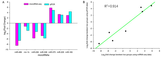 All the selected DEMs showed the same expression trends in the qPCR and miRNA-seq data (Figure 4A). The correlation of fold change between the qPCR and miRNA-seq expression levels was 0.914 (Figure 4B). These results indicated that the DEMs identified using the RNA-seq data were reliable.