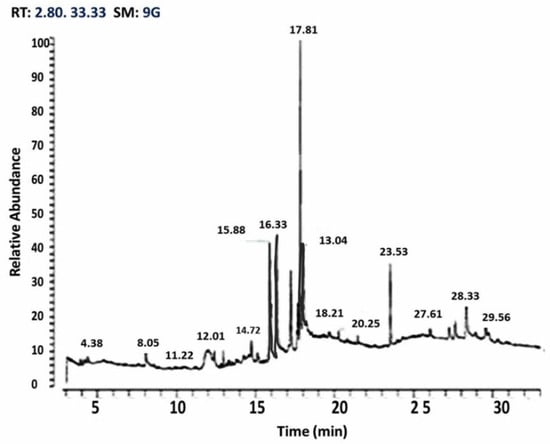 A trace GC Ultra-ISQ mass spectrometer with a direct capillary column TG–5MS (30 m × 0.25 mm × 0.25 μm) was injected by 10 μL of MO ethanolic extract. The column oven temperature was started at 60 °C and then increased by 5 °C/min until reaching 280 °C. The injector and detector (MS transfer line) temperatures were kept at 250 °C. A helium flow rate of 1 mL/min. was used as the carrier gas for 37.83 min. The solvent delay was 2 min. and diluted samples of 1 μL were injected automatically using auto-sampler AS3000 coupled with GC in the splitless mode. The ion source and quadrupole temperatures were set at 200 and 150 °C, respectively. The mass spectra of the identified components were determined by comparison to NIST 11 mass spectral database (Figure 1).
