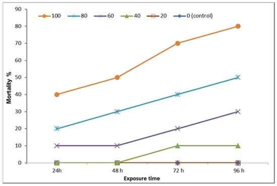 Mortality percentage of fish exposed to different concentration of NaF (20, 40, 60, 80, and 100 mg/L) at different time points (24, 48, 72, and 96 h). The total number of fish/group = 10 fish.