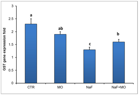 GSTs are a family of phase II detoxifying enzymes that are responsible for the conjugation of GSH to several electrophilic compounds [69]. In fish, GSTs play a major role in the antioxidant function and detoxification of various xenobiotics including fluoride. Several studies have been already reported that fluroacetamide reduced GST activity in various tissues due to oxidative stress [70,71]. This reduction of GST activity is directly related to increased levels of lipid peroxidation, where it plays a crucial role in eliminating MDA, the end-products of oxidative damage. Interestingly, the molecular expression of GST may be considered as a biomarker for xenobiotics exposure [72,73,74]. Many toxicologists expect that the highest level of GST expression may occur in the liver where metabolism mostly occurs [75]. In this study, the mRNA expression of GST in the liver of NaF-exposed fish showed a significant reduction compared to control fish. This reduction in GST may be related to the significant reduction of GSH, which is the substrate for GPx that provides a mechanism for GST involvement in the conjugation and elimination of fluoride [76]. In addition, it is well known that the GST enzyme catalyzes the reaction via the thiol (-SH) group of glutathione (GSH) leading to the neutralization of the xenobiotic and making it more water soluble [77]. However, supplementation of MO to NaF-exposed fish led to a significant elevation of GST mRNA expression in the liver. This elevation in GST activity might be attributed to the decline of free radical production by MO supplementation which, in turn, increases in the antioxidant system.