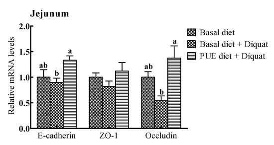The relative mRNA expressions of intercellular junction proteins (E-cadlherin, ZO-1, occludin) are shown in Figure 2. The E-cadherin and occludin mRNA expressions in the jejunum and ileum of the piglets treated with the puerarin diet were greater (p < 0.05) than those on the basal diet + diquat treatment. However, there were no significant differences in the ZO-1 mRNA levels in the jejunum and ileum among the piglets receiving the three treatments (p > 0.05).