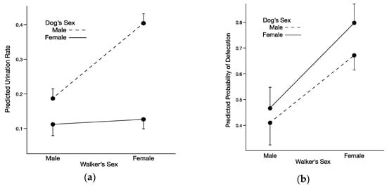 Scent-marking behaviors of shelter dogs in relation to sex of dog and sex of walker. (a) Predicted rates of urination by male and female dogs when walked by male or female walkers. (b) Predicted probabilities of defecation by male and female dogs when walked by male or female walkers. Walks were 20 min in duration.