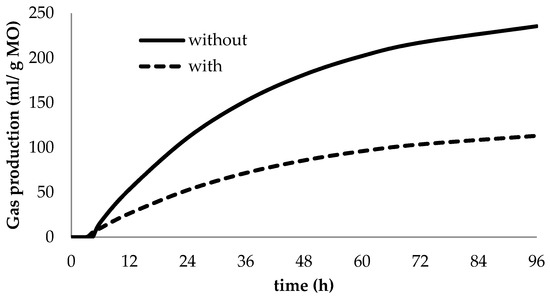 There was an effect (p ≤ 0.001) of CT inclusion on IVDMD and IVOMD regardless of the rumen fluid source. The inclusion of CT inhibited fermentation as indicated by the model parameters (Table 2), visualized in Figure 1. The partitioning factor is a measure created to bring together two variables: degradability and gas production. It was greater (p ≤ 0.001) when CTs were included in the diet (Table 2).