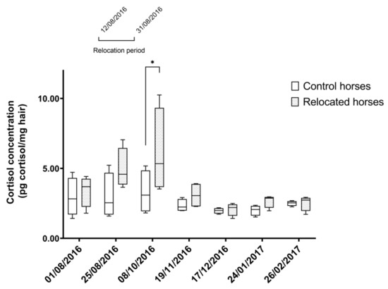 Hair cortisol concentrations in control and relocated horses during the study period. Hair cortisol concentrations (HCCs) (pg cortisol/mg hair) in control horses (N = 4, n = 28) and HCCs (pg cortisol/mg hair) in relocated horses (N = 4, n = 28) over the time of the study. Relocation period took place between 12th of August 2016 and 31st of August 2016. Asterisks represent significant differences between groups (p < 0.05). Median (25% percentile, 75% percentile). N = number of horses per group; n = number of determinations of HCCs.
