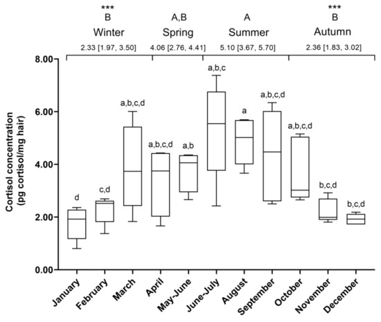 Fluctuation of hair cortisol concentrations over a year. Representation of hair cortisol concentrations (HCCs) (pg cortisol/mg hair) in horses (N = 5, n = 53) during a year. Different lowercase letters represent significant differences between months. Different uppercase letters represent significant differences between seasons (*** p < 0.001). Median (25% percentile, 75% percentile). N = number of horses per group; n = number of determinations of HCCs.