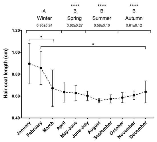Hair growth rates over a year. Hair growth (cm) for each month and season in the horses included in the study (n = 5). Different uppercase letters represent significant differences between seasons. Different lowercase letters represent significant differences between months (* p < 0.05, **** p < 0.0001). Mean ±SD.