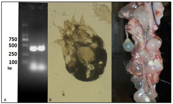 (A) Analysis of Salmonella pure culture with the primer set: ST11-ST15. Lane 1 and Lane 2: Salmonella (B) Sarcoptes scabiei from the rabbit skin, and (C) Cysticercus pisiformis from the peritoneal cavity of rabbits.