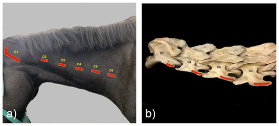 (a) Lateral neck with palpable landmarks of the caudal transverse processes marked in relation to the cervical vertebrae (C1–C6). (b) Equine cervical vertebrae C2 to C5, with red lines indicating palpable landmarks.