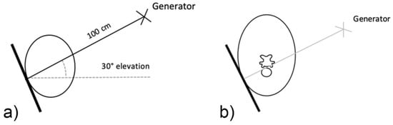 Lateral 30° dorsal-ventral oblique view, left and right side required (a). Ideal positioning for image capture and superimposition of the C6 ventral lamina over the trachea (b).