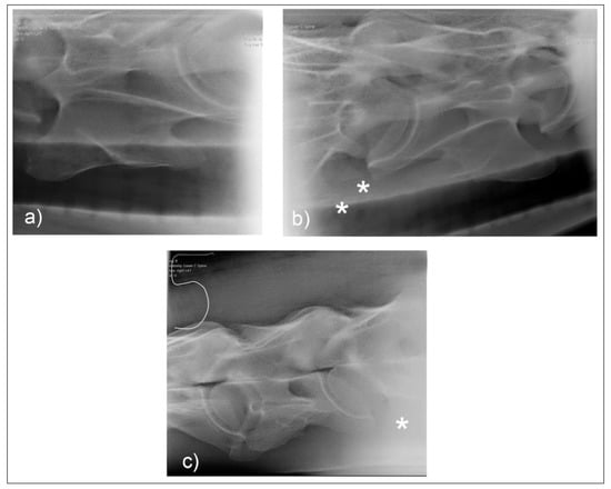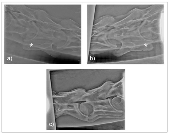 Normal radiographic appearance of C6 with 30° dorsal to ventral oblique right (a) and left (b). In the laterolateral view (c), the head is to the left, and both left and right ventral laminae are visible. Note the incomplete centers of ossification of the ventral laminae (*). (Images have been left in nonstandard orientation for simplicity).